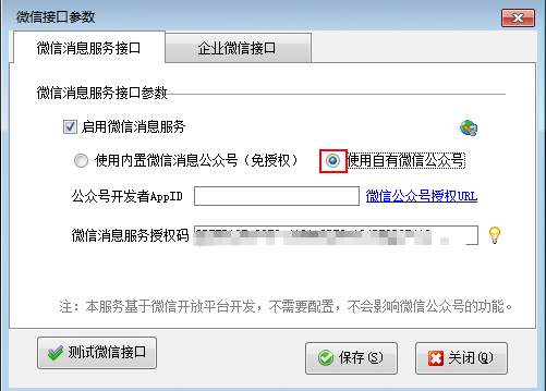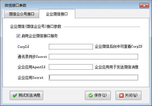 ????在功能導(dǎo)航窗點(diǎn)擊“擴(kuò)展應(yīng)用”—》“微信接口參數(shù)”可以打開微信接口參數(shù)設(shè)置窗口,可以設(shè)置微信消息服務(wù)接口參數(shù)以及企業(yè)微信接口參數(shù)。