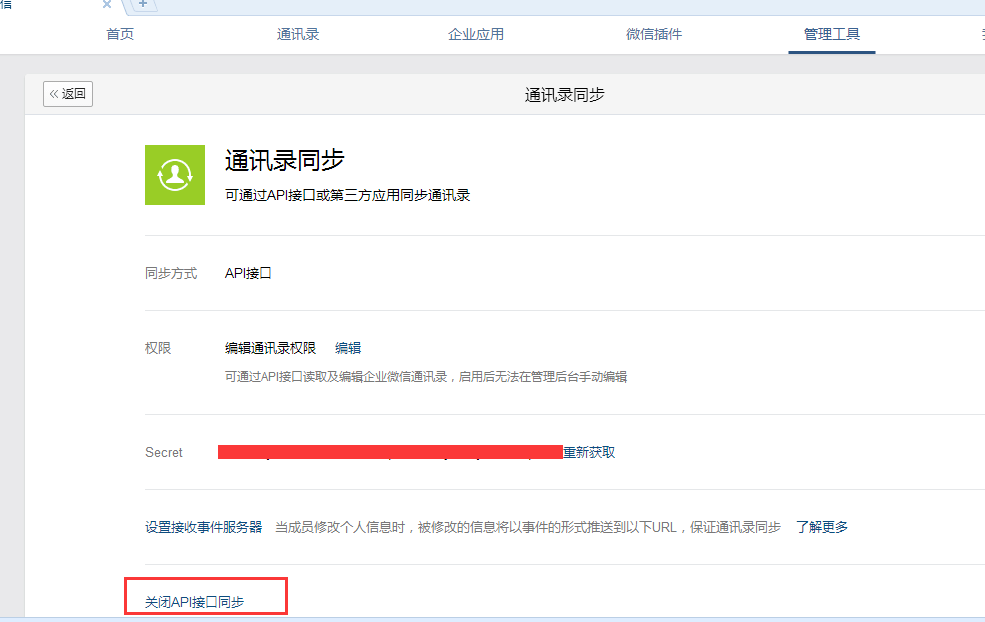 ????通訊錄同步Secret:在企業(yè)微信內(nèi)點(diǎn)擊“管理工具”—》“通訊錄同步”,在通訊錄同步界面開啟API接口同步,開啟后可以查看通訊錄同步Secret。