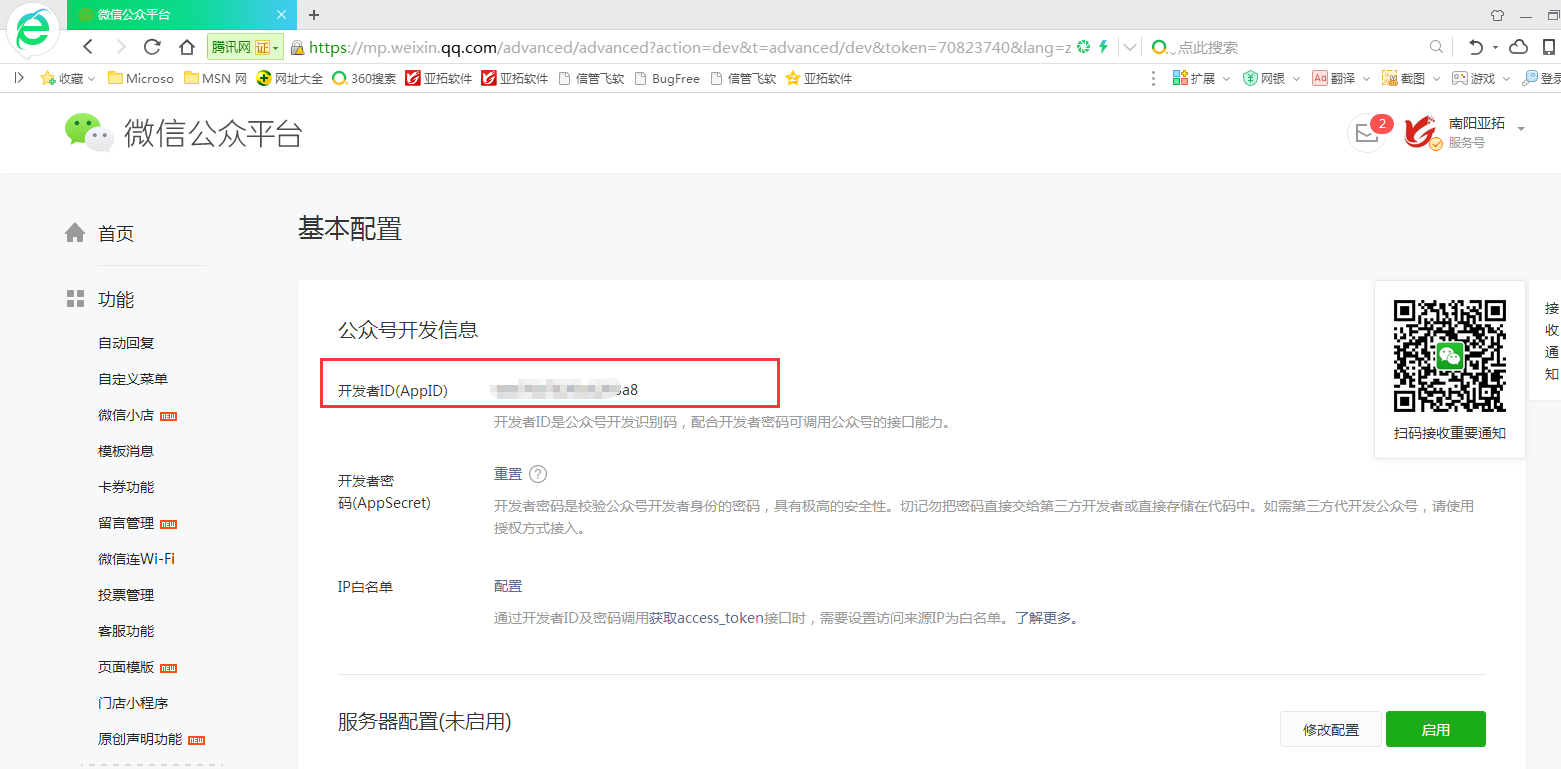 ????公眾號(hào)開發(fā)者 AppID:登錄企業(yè)微信公眾號(hào),在微信公眾平臺(tái)的首頁(yè)導(dǎo)航欄下拉到最后,選擇開發(fā)模塊的“基本配置”。在基本配置中復(fù)制下“開發(fā)者 ID(AppID)”信息。如下圖所示:
