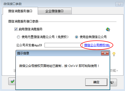 授權(quán)微信云服務(wù):把公眾號(hào)開發(fā)者 ID 信息復(fù)制到參數(shù)配置界面的公眾號(hào)開發(fā)者 AppID 中,點(diǎn)擊“復(fù)制微信公眾號(hào)授權(quán)頁(yè)面 URL”,提示“授權(quán)頁(yè)面地址已復(fù)制,按 Ctrl+V 即可復(fù)制粘貼使用”。如下圖所示:
