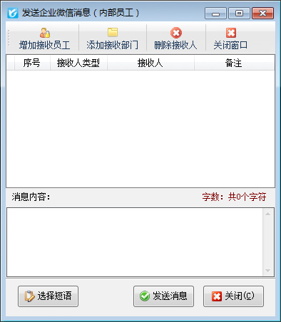 ????在功能導(dǎo)航窗點(diǎn)擊“擴(kuò)展應(yīng)用”—》“發(fā)送企微消息”可以打開發(fā)送企業(yè)微信消息窗口,可以編輯消息內(nèi)容對(duì)企業(yè)內(nèi)部員工發(fā)送微信企業(yè)消息,其界面如下圖所示。