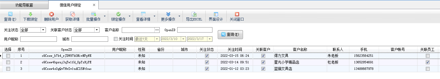 綁定操作:在工具欄點(diǎn)擊“綁定操作”按鈕可以對(duì)微信綁定用戶進(jìn)行(取消)綁定客戶和(取消)綁定員工操作。