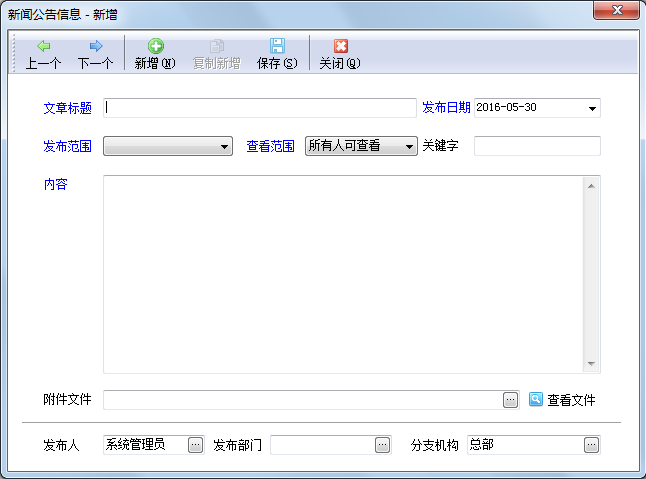 ????新增新聞公告:點(diǎn)擊工具欄的“新增”按鈕即可新增新聞公告,可以選擇“發(fā)布范圍”及“查看范圍”,發(fā)布在“內(nèi)部”時(shí),有查看權(quán)限的操作員登錄系統(tǒng)后即可查看到已發(fā)布的新聞公告,發(fā)布在“客戶服務(wù)平臺(tái)”時(shí),客戶賬號(hào)在“訂貨管家”系統(tǒng)內(nèi)可以查看到已發(fā)布的新聞公告。