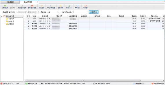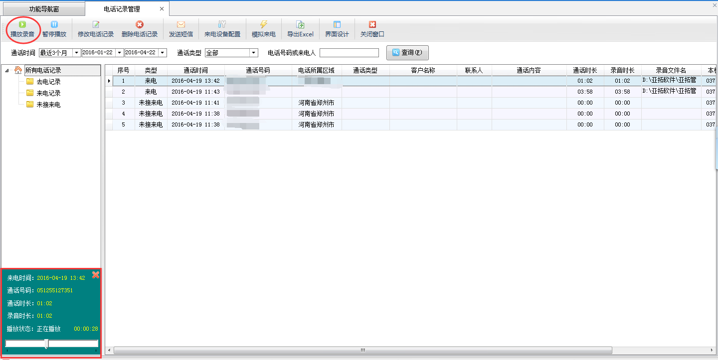 ????在電話記錄管理界面選擇通話時(shí)間,輸入來電號(hào)碼或者來電人信息查詢即可查詢到我們所需要的來電信息,選擇所需要的來電信息,點(diǎn)擊“播放錄音”按鈕即可播放當(dāng)前來電的通話自動(dòng)錄音,點(diǎn)“暫停播放”即可暫停正在播放的錄音文件。