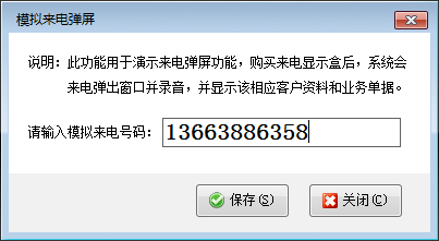 模擬來電:此功能可以實(shí)際模擬演示來電彈屏功能,在模擬來電彈屏窗口輸入模擬來電號(hào)碼,點(diǎn)擊“保存”后系統(tǒng)會(huì)自動(dòng)彈出來電彈屏窗口,如下圖所示: