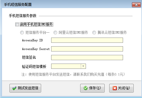 短信配置:在工具欄點(diǎn)擊“短信配置”按鈕,可啟用手機(jī)短信服務(wù)。支持短信服務(wù)平臺(tái)、阿里云短信SMS服務(wù)、騰訊云短信SMS服務(wù)。如下圖所示: