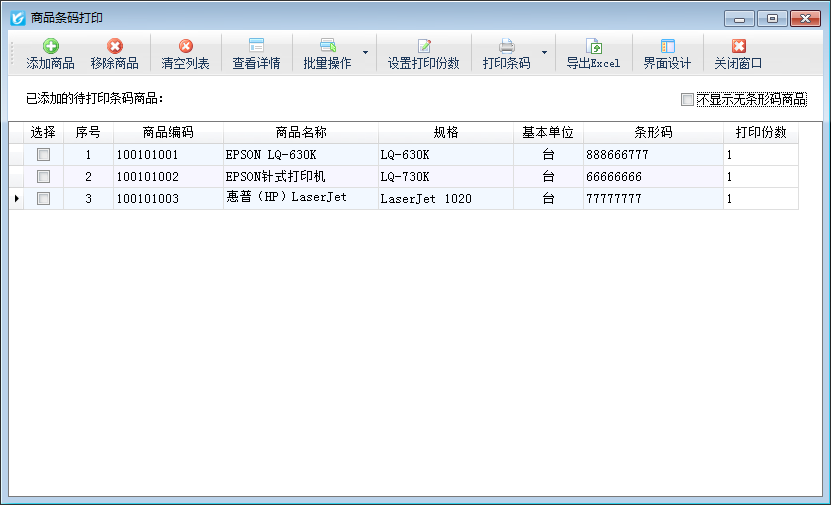 移除商品:在工具欄點(diǎn)擊“移除商品”按鈕,可以移除已添加到待打印商品列表內(nèi)的無需打印條形碼的商品。