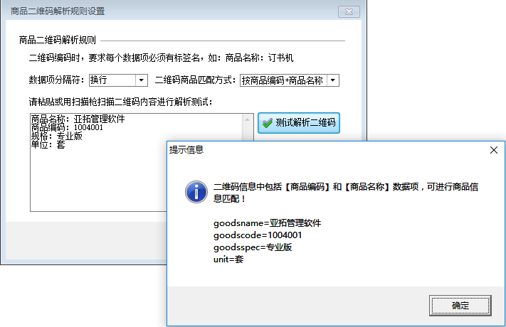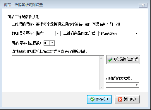 ????在功能導(dǎo)航窗點(diǎn)擊“擴(kuò)展應(yīng)用”—》“商品二維碼規(guī)則”可以設(shè)置商品二維碼解析規(guī)則,其界面如下圖所示。