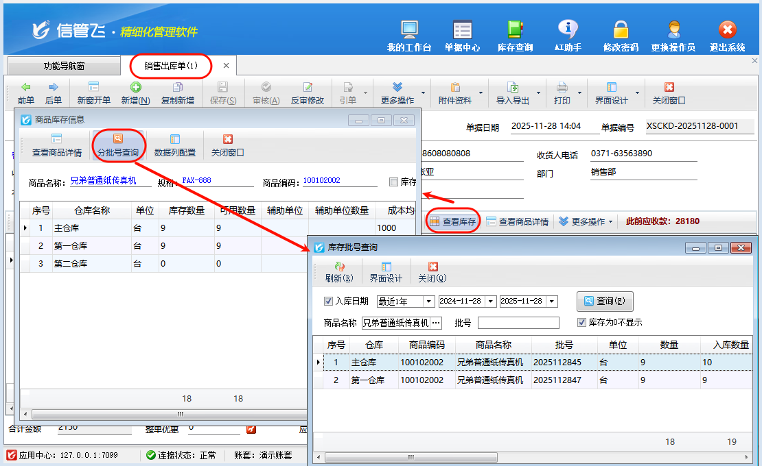 ????銷售開單界面“查看庫存”可查看商品在不同倉庫的庫存數(shù)量、可用數(shù)量、成本均價、庫存金額等,批號商品可點擊“分批號查詢”,會彈出商品不同批號在不同倉庫的庫存數(shù)量,如下圖所示: