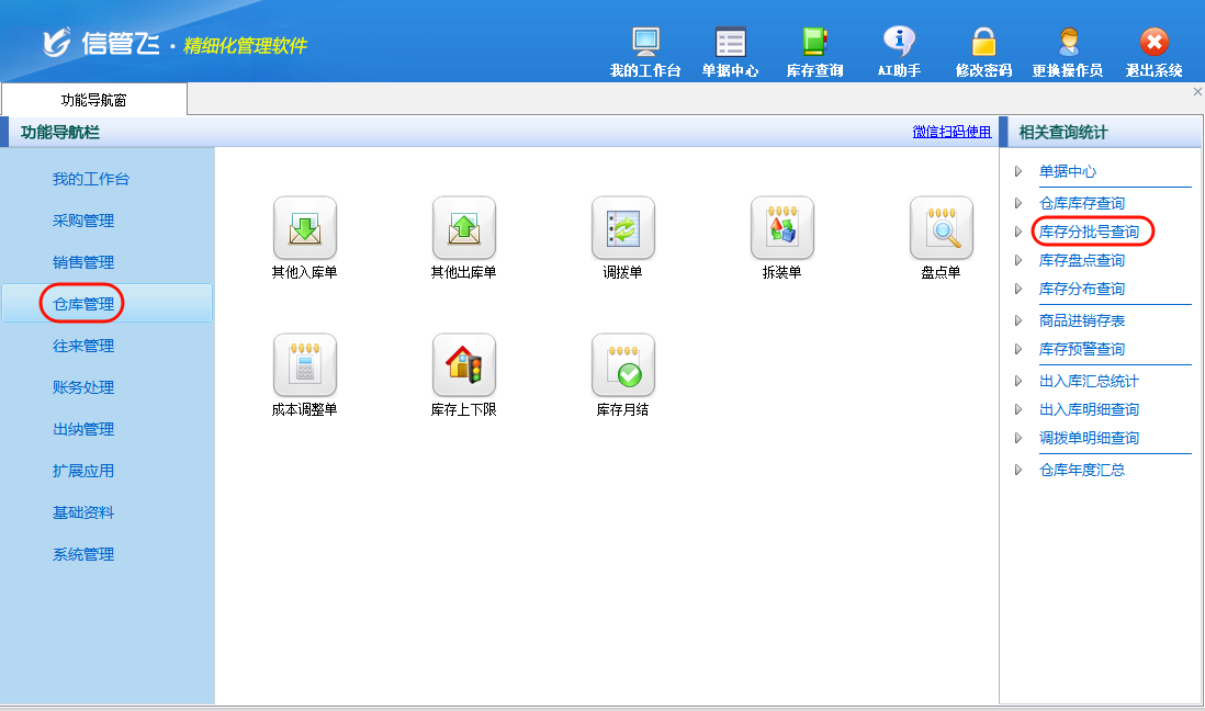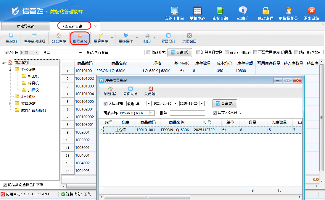 ????倉庫管理相關查詢統(tǒng)計中可查看商品的庫存數(shù)量,批號商品庫存數(shù)量可在“庫存分批號查詢”和“庫存查詢”中查看。