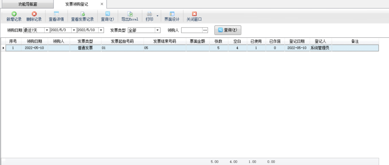 ????發(fā)票領(lǐng)購登記是對銷項(xiàng)發(fā)票空白發(fā)票的領(lǐng)購登記,發(fā)票領(lǐng)購登記后,在銷項(xiàng)發(fā)票管理界面會出現(xiàn)登記的空白發(fā)票記錄,可以用來填開發(fā)票。
