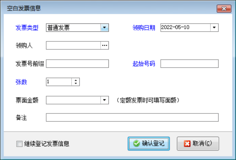 新增記錄:點(diǎn)擊“新增記錄”按鈕,進(jìn)入“空白發(fā)票信息”窗口,如下圖所示,其中“起始號碼”、“張數(shù)”是必填項(xiàng),其他內(nèi)容根據(jù)自己的業(yè)務(wù)需要進(jìn)行填寫,最后點(diǎn)擊“確認(rèn)登記”即可。