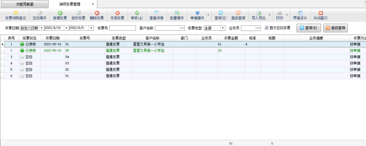 查詢:可以根據(jù)開票日期、發(fā)票號、客戶名稱、發(fā)票類型、業(yè)務(wù)員等信息查詢銷項(xiàng)發(fā)票。