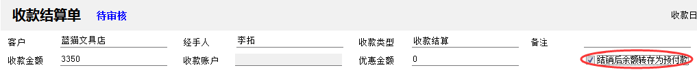 ????部分情況下,客戶付款會多出一些作為預(yù)付款(比如此前欠款 4960 元,客戶為了打款方便,直接給我們付款 5000 元),這種情況可以打勾選擇“結(jié)銷余額轉(zhuǎn)為預(yù)付款”復(fù)選框,軟件會自動生成相應(yīng)的收款結(jié)算單(其收款類型為“客戶預(yù)付款”,如上例其金額為 40 元)。