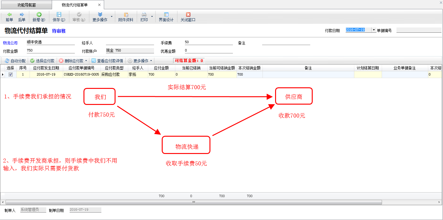 ????需要注意的是如果手續(xù)費(fèi)需要我們承擔(dān),則物流代付結(jié)算單中的可結(jié)算金額等于(付款金額 - 手續(xù)費(fèi) + 優(yōu)惠金額),也就是說物流快遞公司只會將收款金額扣除手續(xù)費(fèi)后的剩余部分金額付給供應(yīng)商,即實(shí)際我們可以跟供應(yīng)商結(jié)銷的金額是不包括手續(xù)費(fèi)的。如果手續(xù)費(fèi)由供應(yīng)商承擔(dān),手續(xù)費(fèi)輸入 0,因?yàn)榭爝f物流公司收取我們的金額,就是可用于結(jié)銷金額。下圖為一個實(shí)際的物流代付款例子: