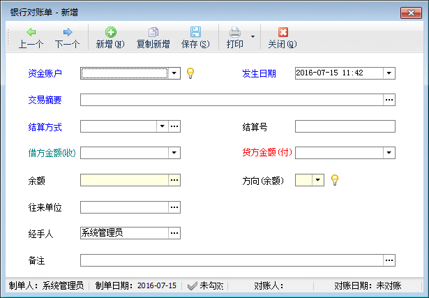 ????在工具欄中點擊“新增”按鈕,系統彈出“新增銀行對賬單”窗口,用戶錄入銀行對賬的相關數據項,如下圖所示: