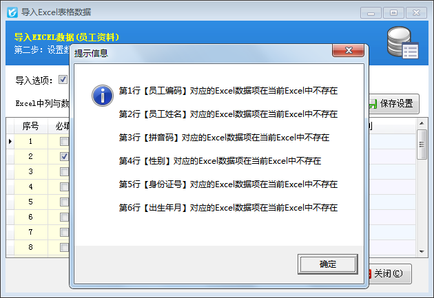 ????如果點(diǎn)“開始導(dǎo)入”按鈕,軟件提示對應(yīng)的數(shù)據(jù)列在Excel中不存在的錯誤提示,如下圖所示: