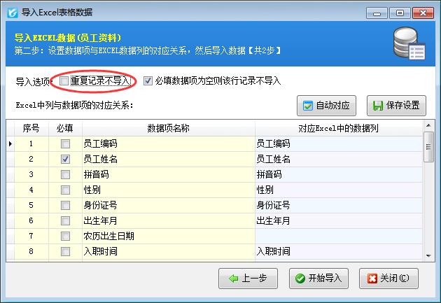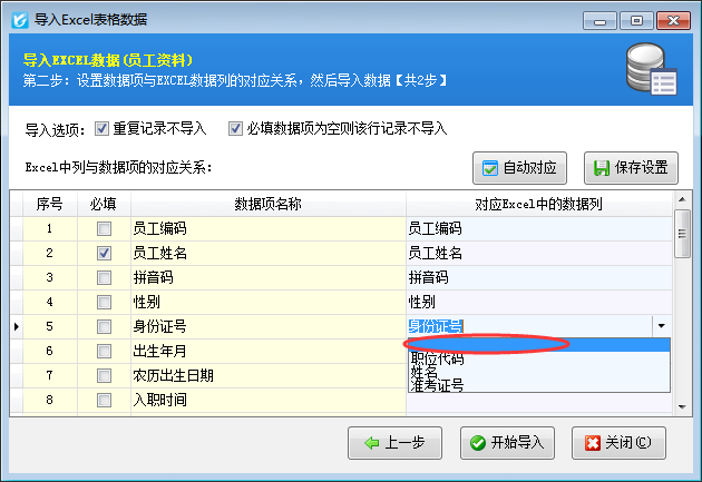配置數(shù)據(jù)項(xiàng)與Excel中數(shù)據(jù)列的對應(yīng)關(guān)系:點(diǎn)“下一步”按鈕配置“數(shù)據(jù)項(xiàng)”與Excel中的數(shù)據(jù)列之間的對應(yīng)關(guān)系。點(diǎn)“自動對應(yīng)”軟件會自動根據(jù)數(shù)據(jù)項(xiàng)名稱和數(shù)據(jù)列列名是否相同進(jìn)行自動匹配。也可以按照下圖所示手工選擇對應(yīng)關(guān)系。