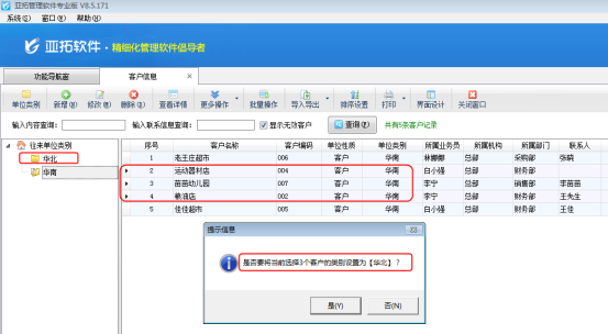 以圖1為例,客戶(hù)單位類(lèi)別是“華南”的一共有5條記錄,現(xiàn)在要把第2條至第4條這3條記錄的單位類(lèi)別改為“華北”。首先點(diǎn)擊第2條記錄,然后按下Shift鍵不松手時(shí)鼠標(biāo)點(diǎn)擊第4條記錄,這樣就可以同時(shí)快速選中第2條至第4條這3條記錄,選中多條記錄后,再按住鼠標(biāo)左鍵不松手,移動(dòng)到單位類(lèi)別“華北”處,此時(shí)系統(tǒng)會(huì)提示“是否要將當(dāng)前選擇3個(gè)客戶(hù)的類(lèi)別設(shè)置為【華北】?”,點(diǎn)擊“是”按鈕即可,如圖2所示。